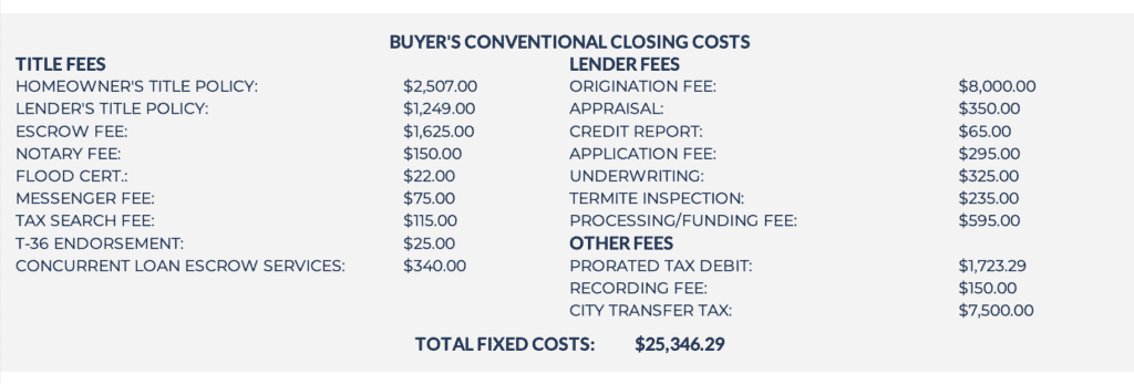 I am often asked to estimate the total closing costs involved in purchasing a home. Many of my clients are first time homeowners and don’t have the experience of working with lenders or going through the entire escrow process. Relatively early in the real estate journey, I will request a ‘buyer net sheet’ from the title company to estimate all of the costs associated with a transaction to give home buyers a better understanding of how much they will actually spend at the conclusion of the deal.